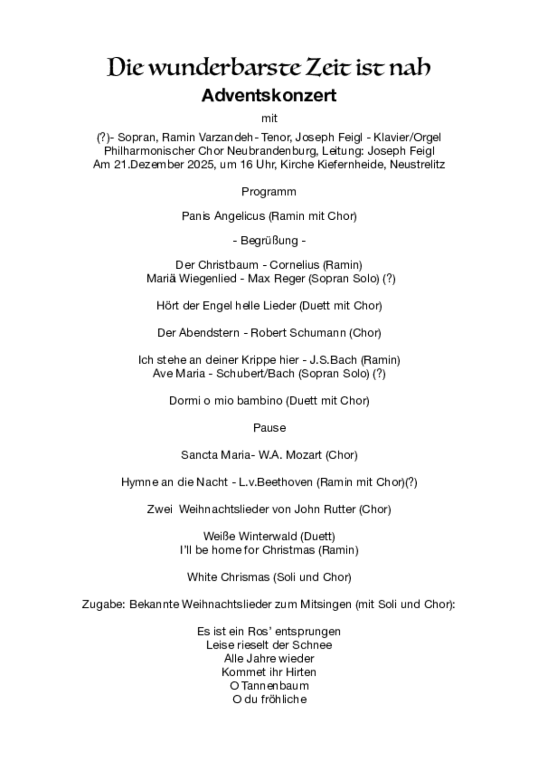 Sonntag, den 21.12.2025: Mitwirkung beim Adventskonzert in der Kirche von Neustrelitz-Kiefernheide