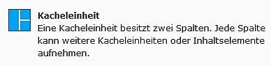 Eine Kacheleinheit besteht aus zwei Spalten. In einer Spalte können weitere Kacheleinheiten oder ein Inhaltselement untergebracht werden. Wird ein Inhaltselement eingefügt, so kann diesem das Kachelseitenverhältniss über die Layoutsauswahl zugewiesen werden.