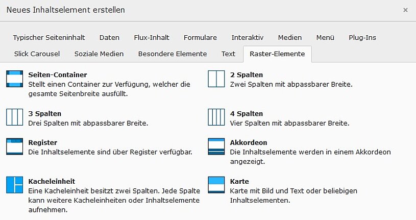 Strukturelemente können durch hinzufügen eines Inhaltselementes erstellt werden. Im Inhaltselementdialog kann das gewünschte Element im Tab "Grid Elements" ausgewählt und im anschliessenden Dialog angepasst werden.